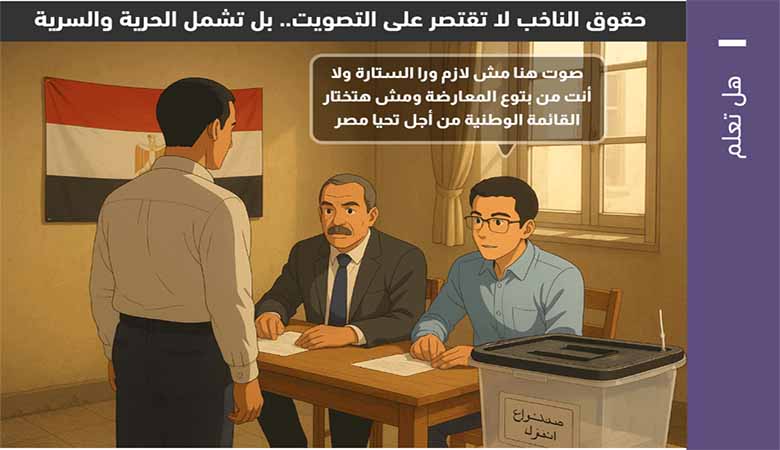 ورغم أن الدستور والقانون المصري لا ينصان صراحة على “حرية الاختيار” أو “الحق في المعرفة”، إلا أنهما يضمنان هذين الحقين ضمنًا من خلال النصوص التي تكفل نزاهة الانتخابات، المنافسة العادلة، وشفافية الإجراءات. وتشكل هذه الضمانات قاعدة أساسية لتمكين الناخب من ممارسة حقه في المعرفة والاختيار الحر.