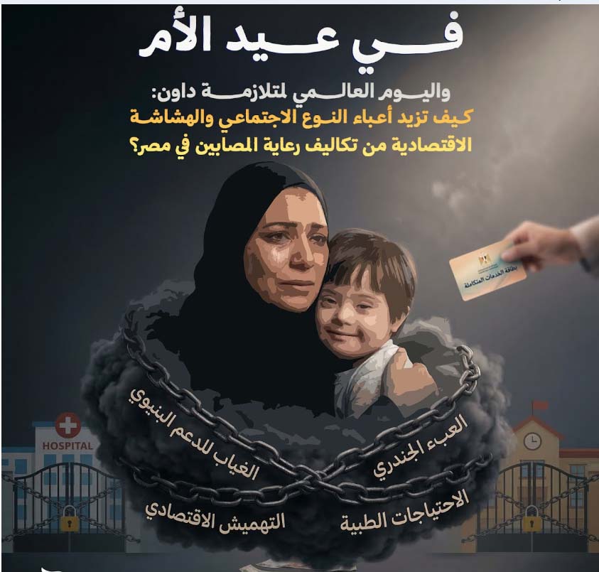 بالتزامن مع اليوم العالمي لمتلازمة داون مع عيد الأم في 21 من مارس، نشرت المفوضية المصرية للحقوق والحريات، تدوينة تربط بين المناسبة المزدوجة، في محاولة لخلق تقاطع إنساني بين مصابي المتلازمة وأمهاتهم لفهم وضع النساء والفئات المهمشة ممن يتكفلن برعاية ذويهن، ليكون الاحتفال بأمهات المصابين/ات بالمتلازمة وأبنائهن حيزا للنقاش حول "كيف يتداخل العبء الجندري للأمهات والحالة الصحية للمصابين، ويشكل واقع هذه الشريحة من الأسر المصرية؟"